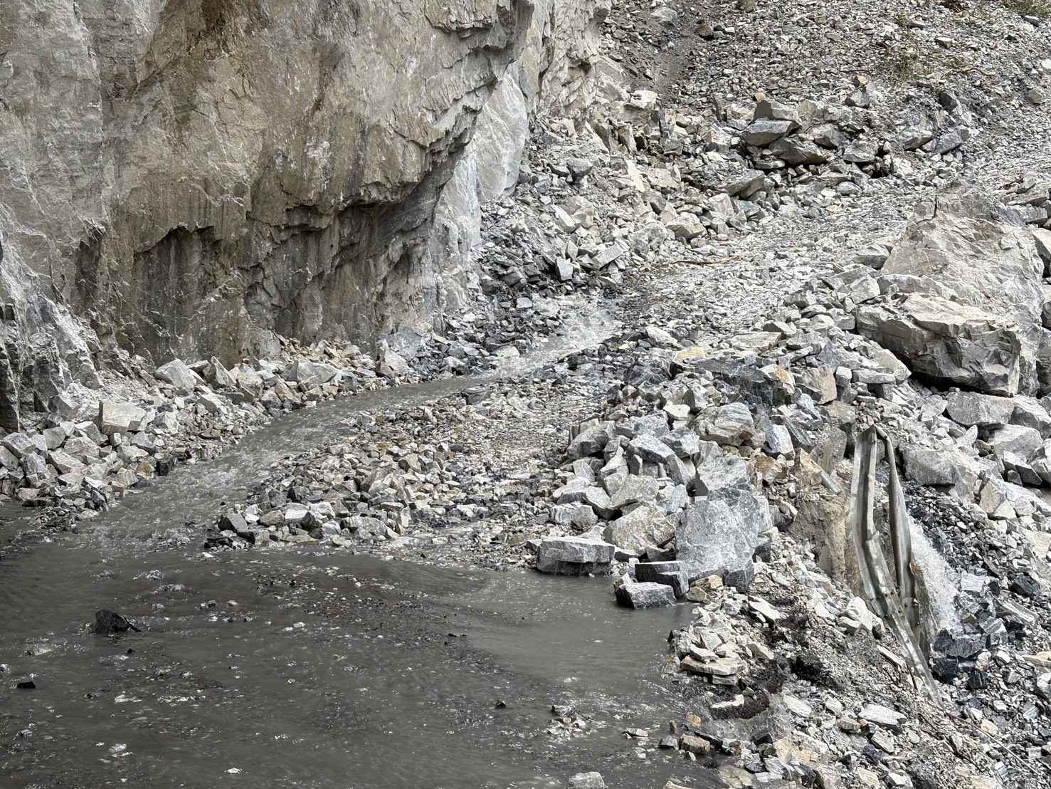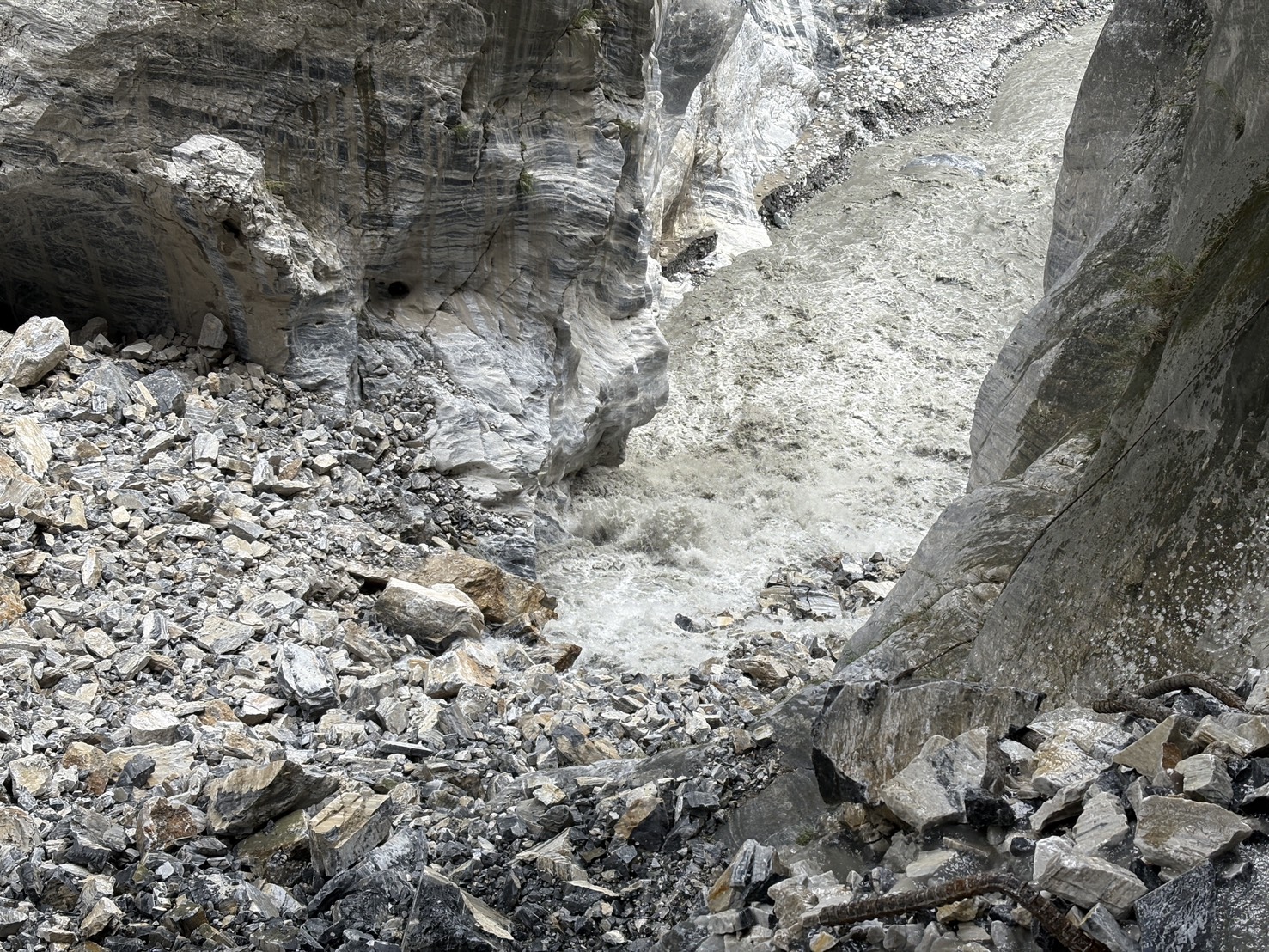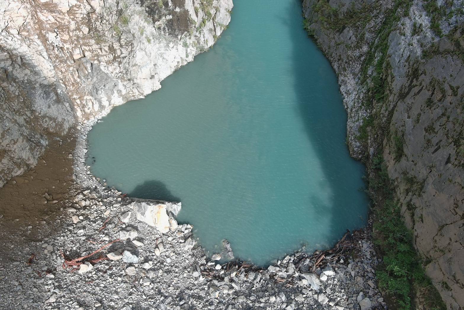 一、今(10/21)日監測顯示,燕子口堰塞湖壩高約40公尺,水位高程267.06公尺,距離壩頂溢流仍有約2.94公尺之高程,湖水面積為11.1公頃,蓄水量為195萬噸,距壩頂滿庫(230萬噸)仍有35萬噸之蓄水空間,目前壩體下方持續滲流,可能在短期內發生壩體滲流破壞或壩頂溢流潰決。