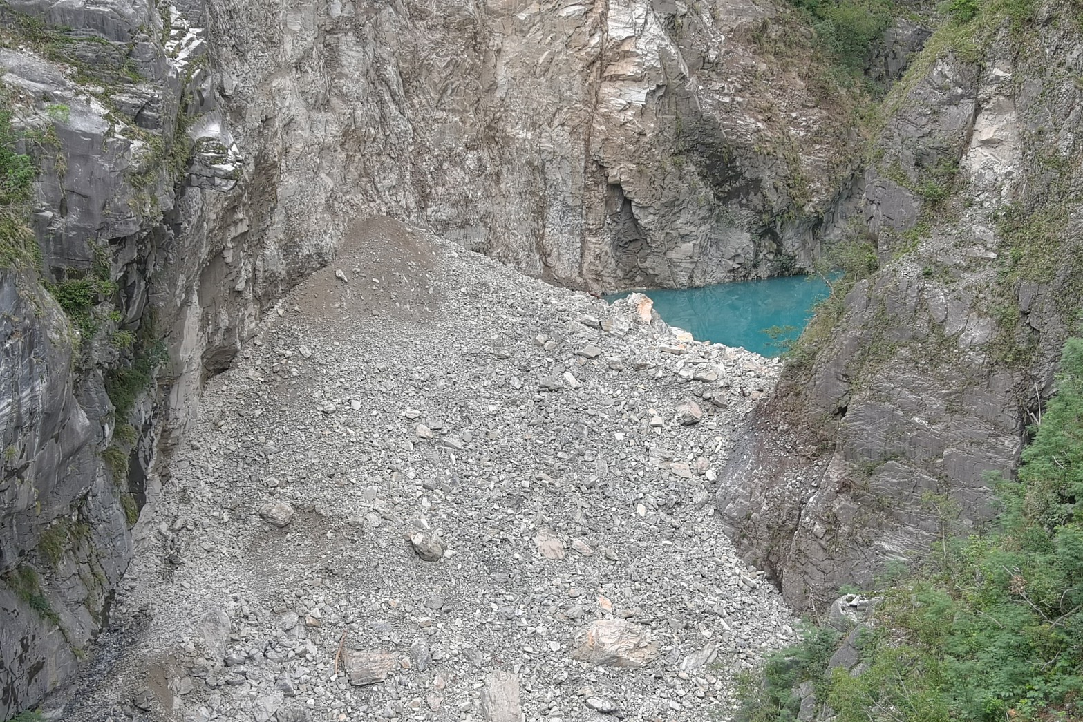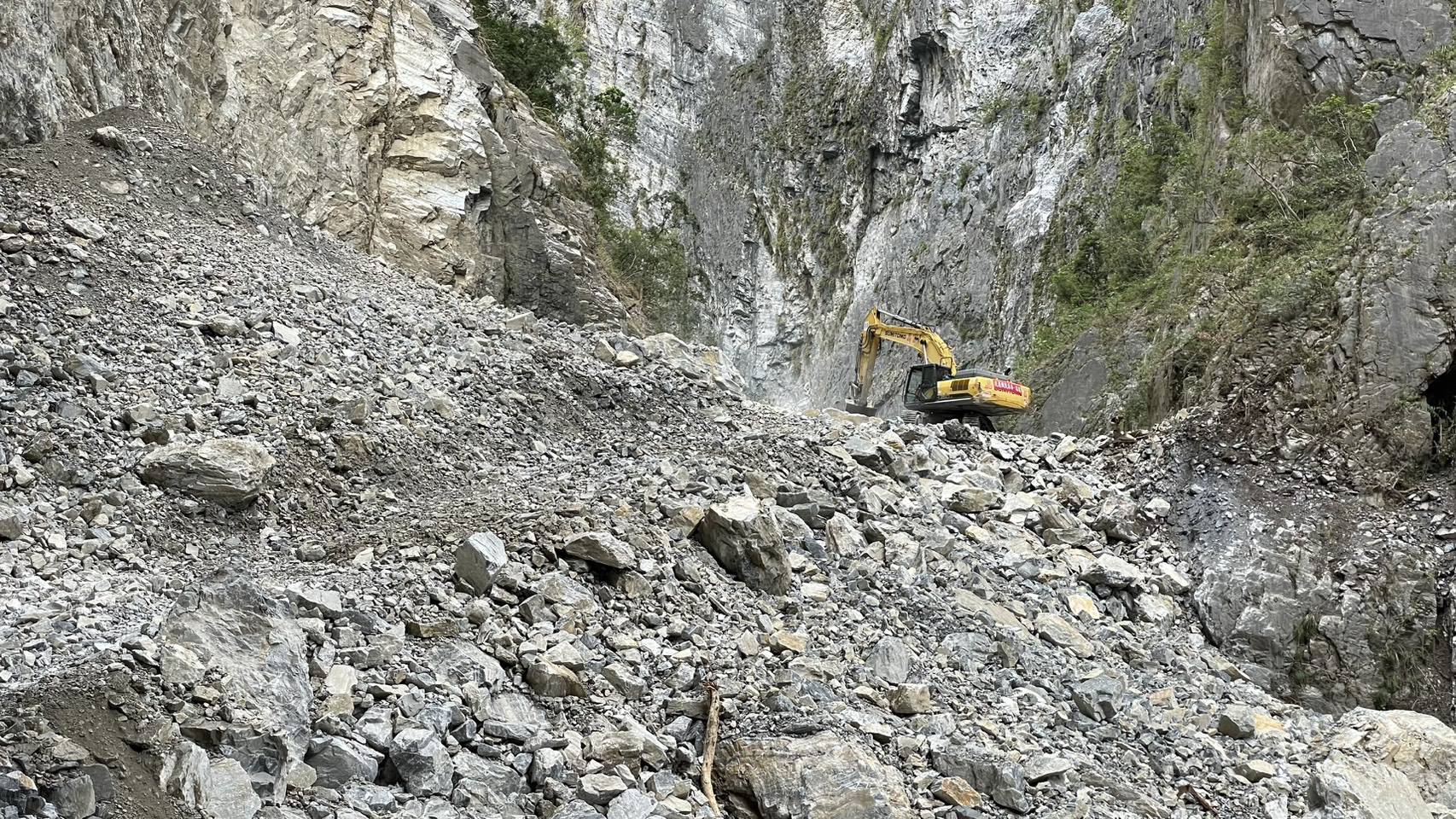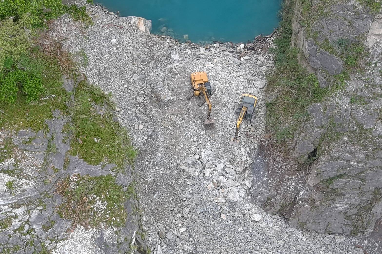 《立霧溪燕子口堰塞湖》 一、今(10/25)日監測顯示,燕子口堰塞湖水位高程266.55公尺,距離壩頂溢流仍有約3.45公尺之高程,湖水面積為11公頃,蓄水量為190萬噸(滿庫為230萬噸),天然壩體積為32萬立方公尺。 二、近期堰塞湖水位穩定、壩體無異常,監測觀察壩體址部已有穩定滲流,滲流情形並無加劇。 三、10/23暫時解除警戒,僅台8線靳珩隧道及魯丹橋維持封閉,及呼籲民眾遠離河道。 四、今日施工便道已推進到達壩頂,預計進行壩頂部分空間降挖作業。 五、持續監測水位、降雨量變化、壩體滲溢及橋面溢流等狀況,如有危險立即發布緊急通報單、細胞廣播簡訊及新聞稿,通知各單位及民眾加強警戒。
