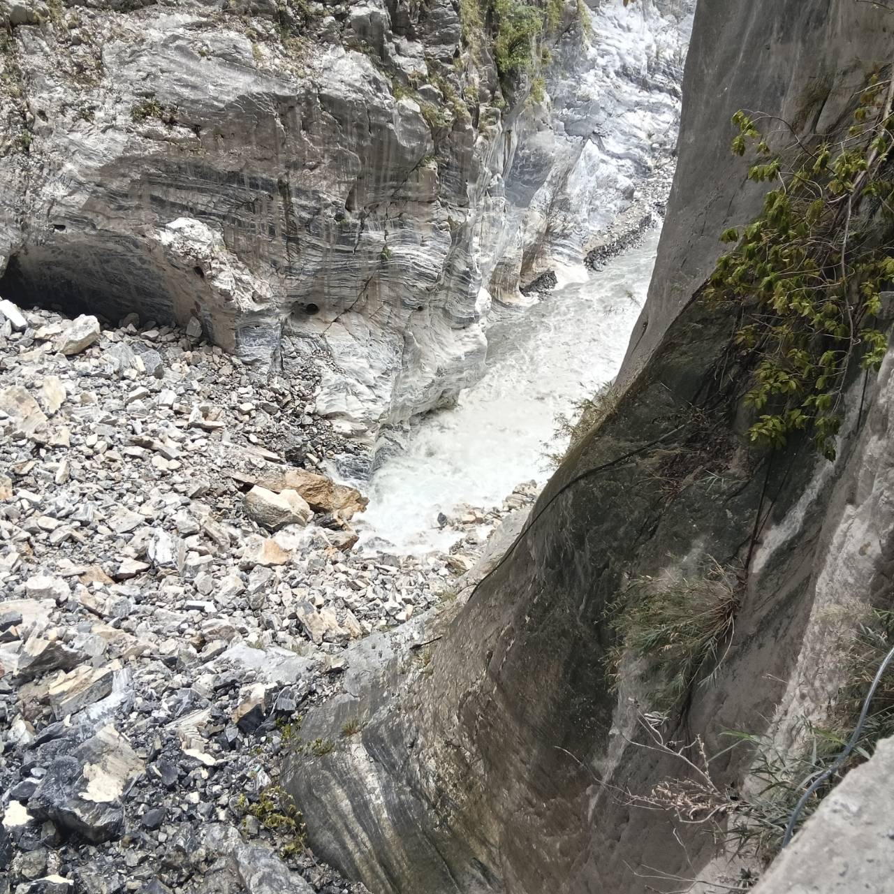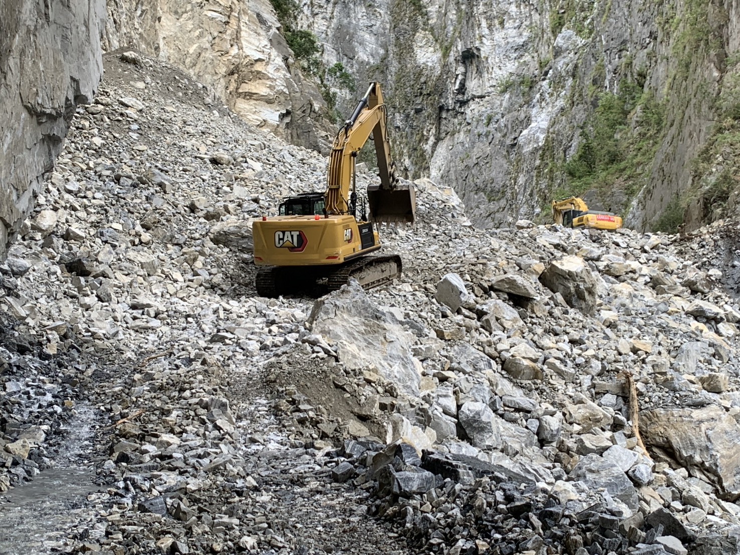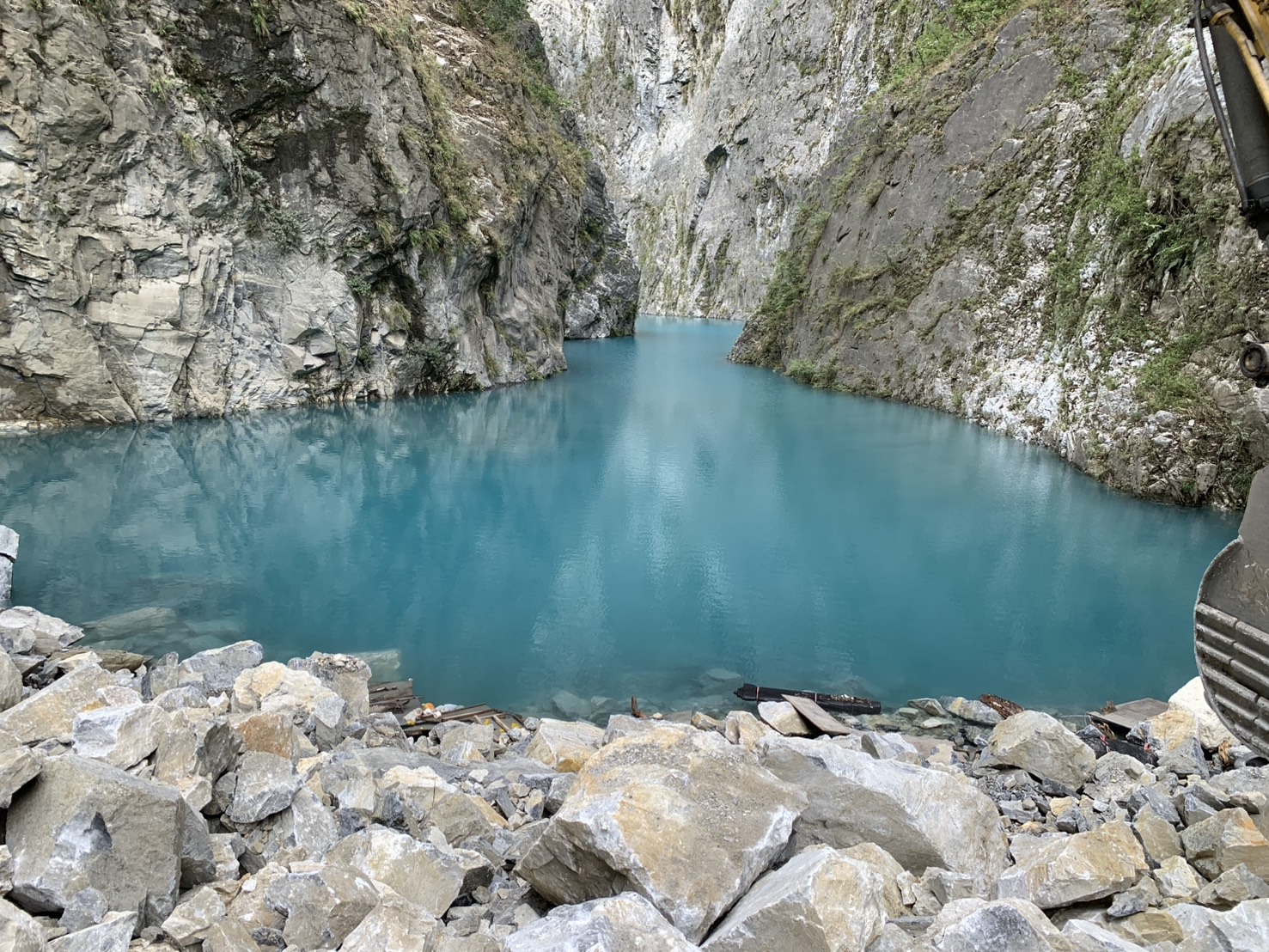 《立霧溪燕子口堰塞湖》 一、今(10/25)日監測顯示,燕子口堰塞湖水位高程266.55公尺,距離壩頂溢流仍有約3.45公尺之高程,湖水面積為11公頃,蓄水量為190萬噸(滿庫為230萬噸),天然壩體積為32萬立方公尺。 二、近期堰塞湖水位穩定、壩體無異常,監測觀察壩體址部已有穩定滲流,滲流情形並無加劇。 三、10/23暫時解除警戒,僅台8線靳珩隧道及魯丹橋維持封閉,及呼籲民眾遠離河道。 四、今日施工便道已推進到達壩頂,預計進行壩頂部分空間降挖作業。 五、持續監測水位、降雨量變化、壩體滲溢及橋面溢流等狀況,如有危險立即發布緊急通報單、細胞廣播簡訊及新聞稿,通知各單位及民眾加強警戒。